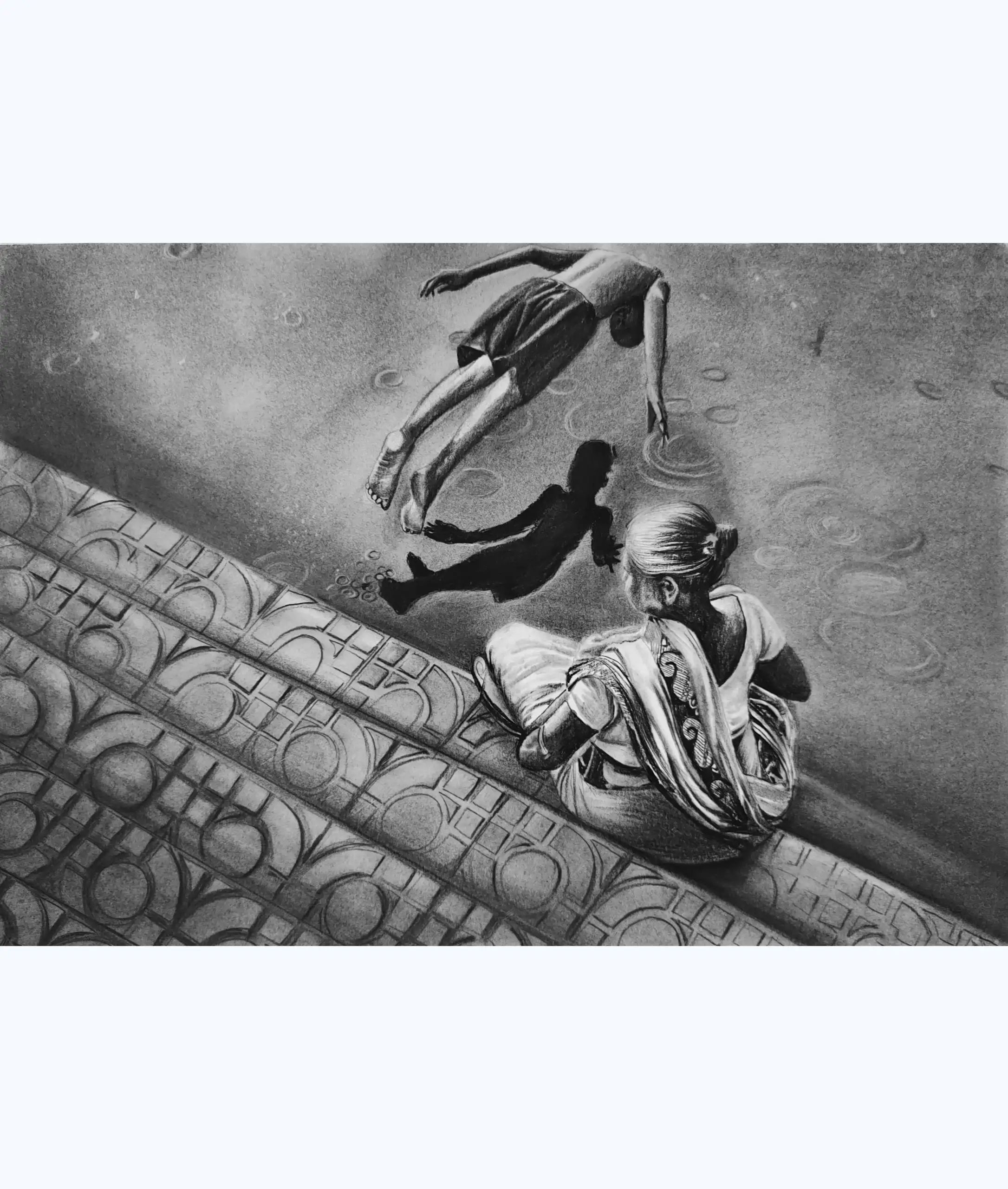 During summer holidays, we as family always planned to visit our grandparents. The most fun activity of the day was endless swimming in a nearby pool after an auspicious & holy festival of sun called Chatth Puja which is celebrated in our family for our wellness and health. Here depicting a scene where my youngest cousin is diving enthusiastically into the pool. By the side is my grandmother who is the strongest woman I know.