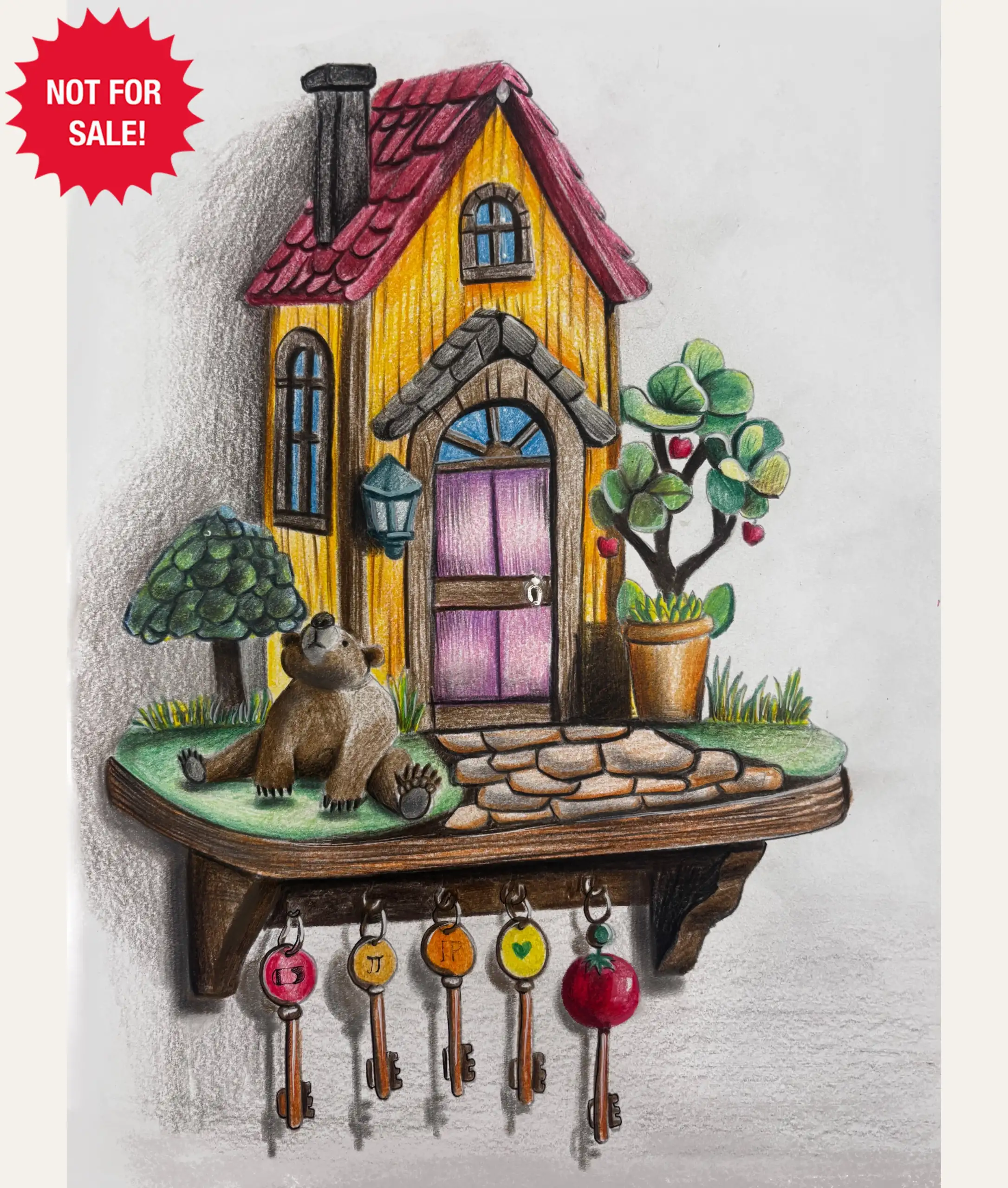 I have designed this key holder to be more than just a practical item. It is a tiny house that symbolizes safety and home. The natural elements and bear make it feel welcoming, and the hooks make it useful. The whole idea behind it is to turn a daily chore into a comforting experience.