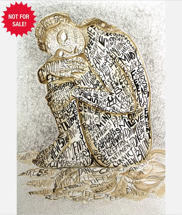 Curled into themselves, the figure lorem figure sits heavy with thoughts. Words cover the body, showing fear, stress, love, and hope. It feels like a mind overloaded, searching for peace. Even in darkness, there is strength and the quiet wish to heal, breathe, and begin again with courage and self-belief slowly returning.