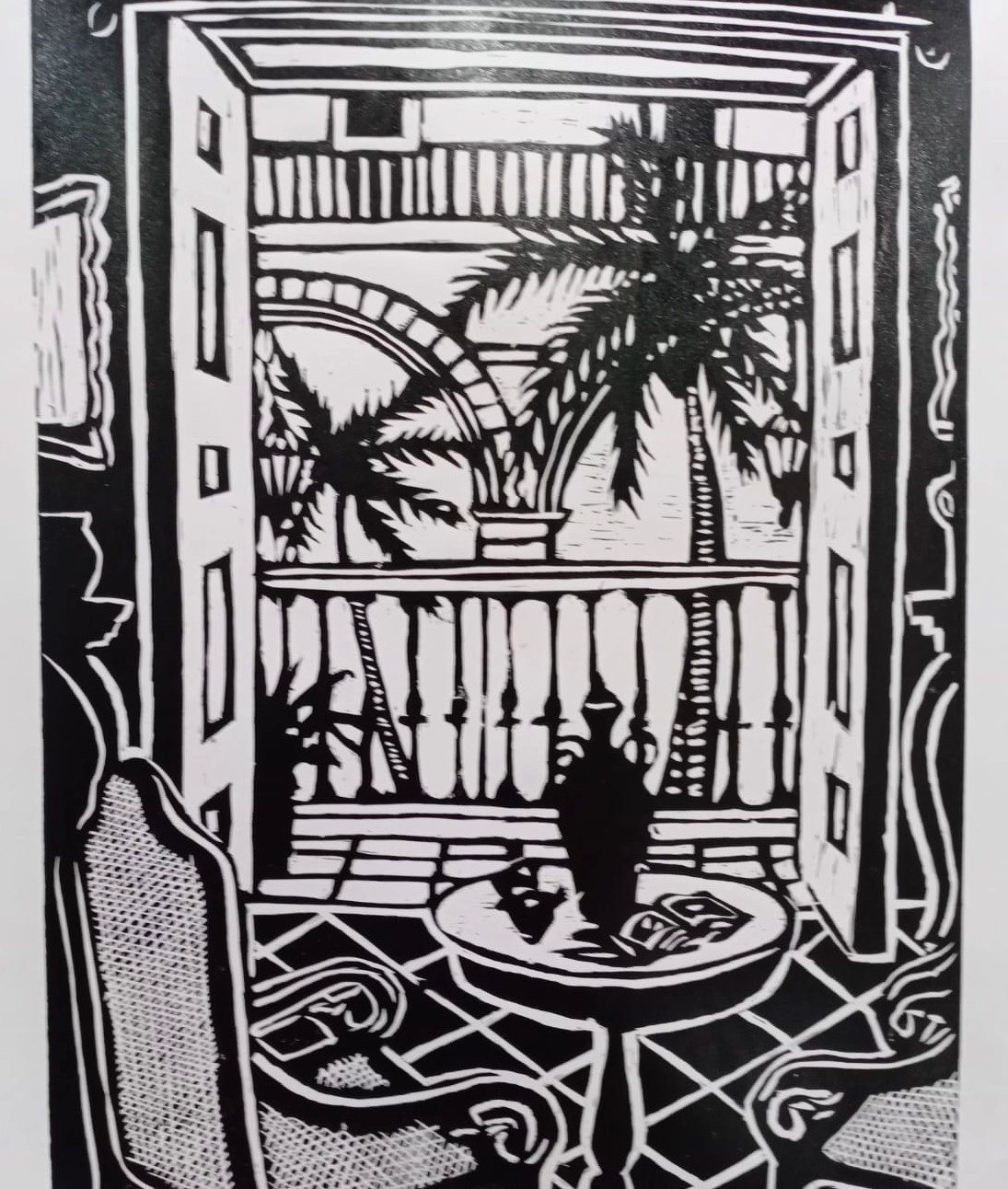 This black and white linocut print captures a scene of a balcony overlooking a courtyard with palm trees. The composition includes chairs, a table with a vase, and a book, creating a peaceful, inviting atmosphere. The graphic and stylized nature of the linocut technique adds a unique depth to the image, where the raised surface of the linoleum creates a striking contrast. The technique itself brings the scene to life in a bold and textured way.