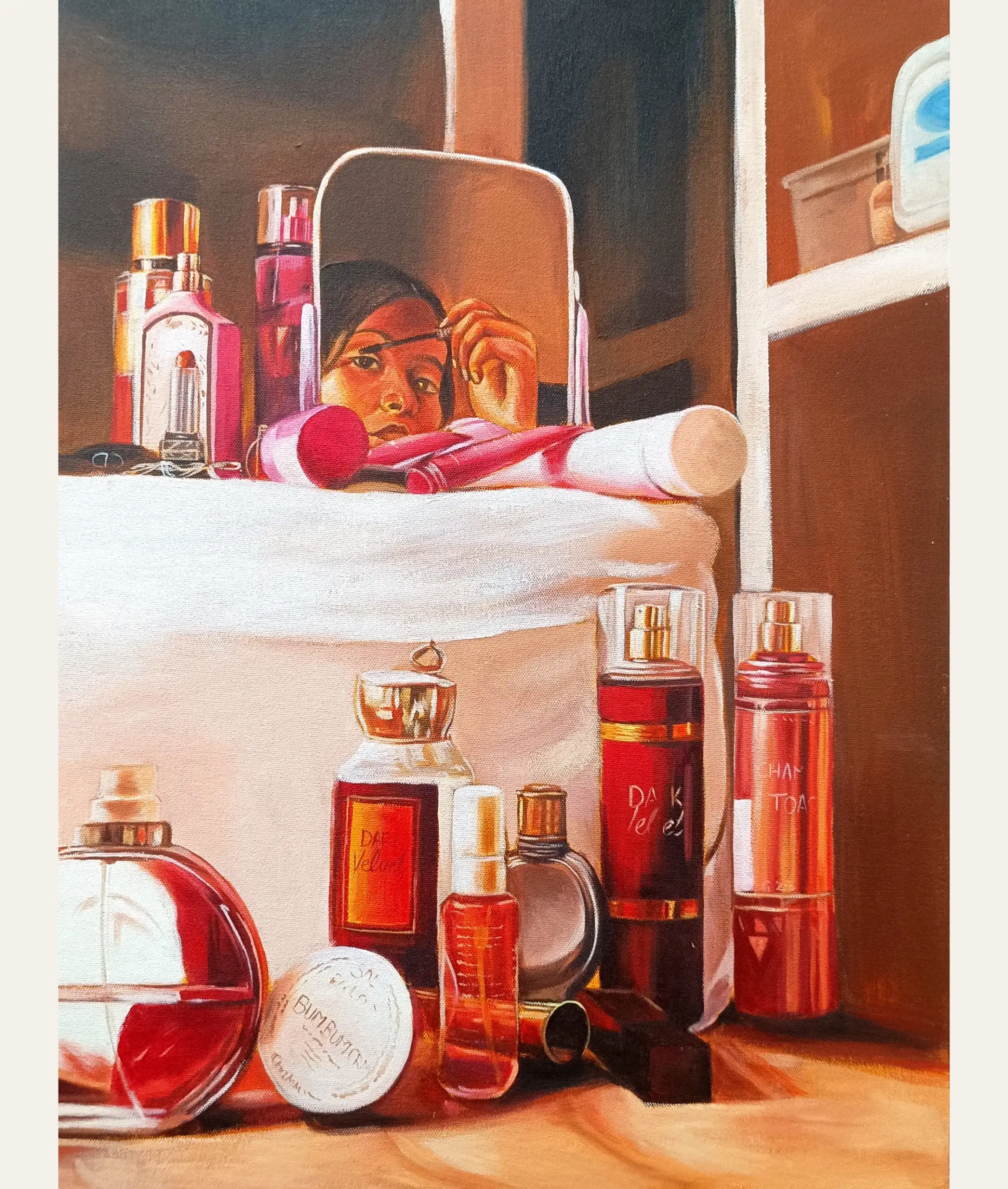 The observation painting on the left is from a phase in my life where i spent at least an hour on makeup to achieve the “perfect” look concealed dark circles, acne covered with setting powder, the perfect lip combo. I thrived on the ideal of perfection. This piece portrays that very moment of helplessness. The painting on the right is when I came out of that loop. I was the happiest. No makeup, no façade.
