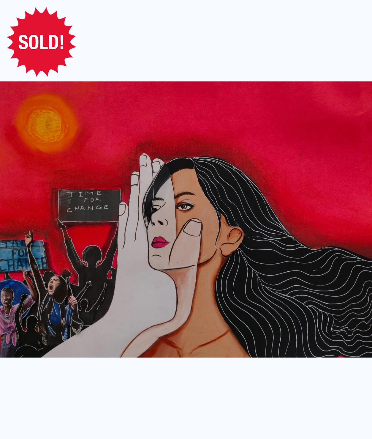 This piece tells a story about being silenced and speaking up at the same time. The white hand over the woman’s face represents control and censorship, while her visible eye and bold lips show courage. The protest scene behind her connects her personal struggle to a larger movement for change. The red sky adds urgency, while her flowing hair suggests freedom and strength that cannot be fully contained.