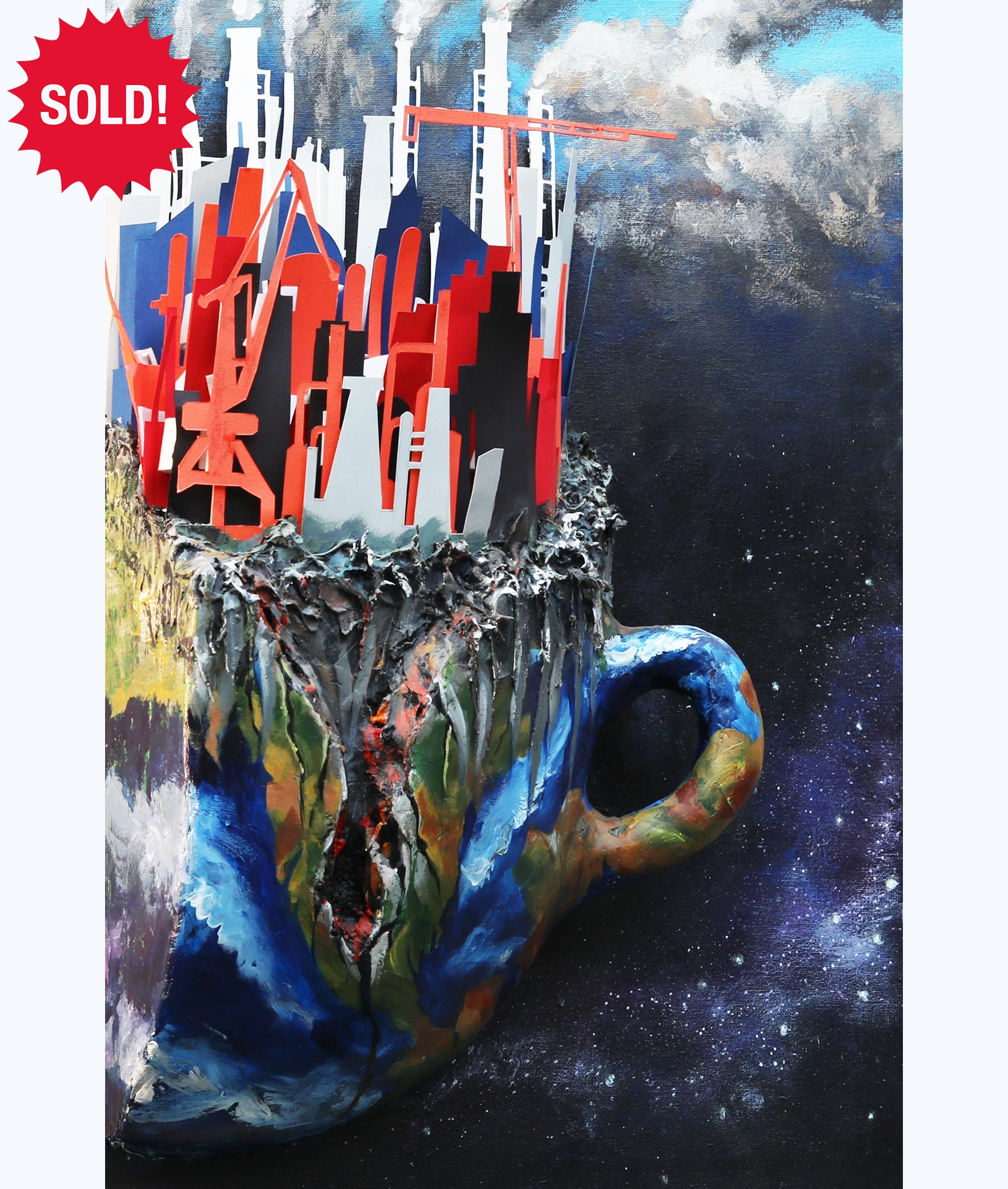 A cup shaped like the Earth overflows with sharp fragments of a growing city. Buildings rise where the surface cracks, hinting at the tension between nature and expansion, as if the planet quietly bears the weight of what we build upon it.