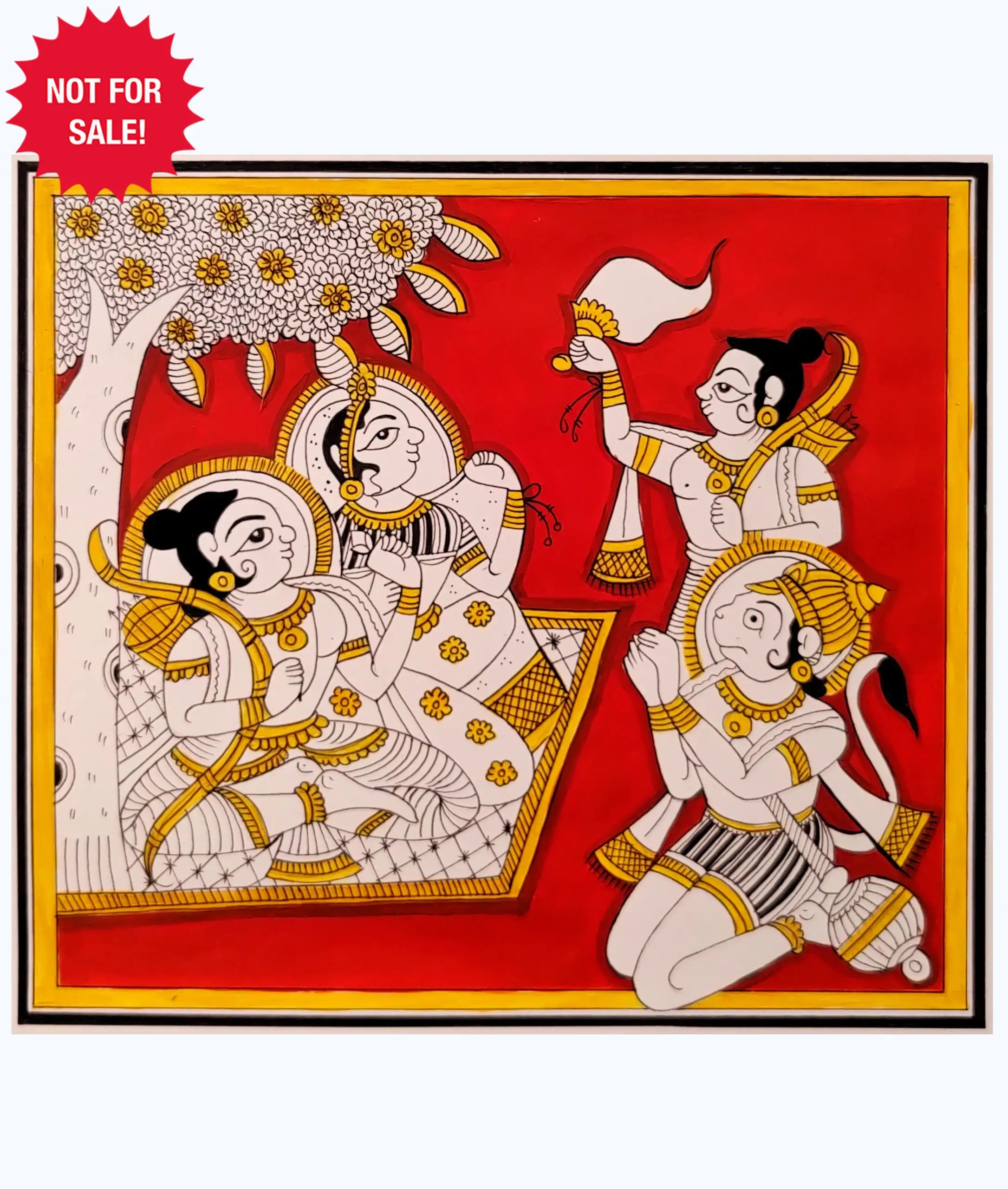 A painting depicting a sacred scene from the Ramayana. Seated beneath a flowering tree, Sita and Rama are shown in intimate divine repose, adorned with intricate gold jewellery. Lakshmana stands vigilantly raising a flag, while a devotional Hanuman kneels humbly in reverence. Executed in striking white, black and gold on a vivid crimson background, the artwork radiates devotion, elegance and timeless spiritual storytelling.