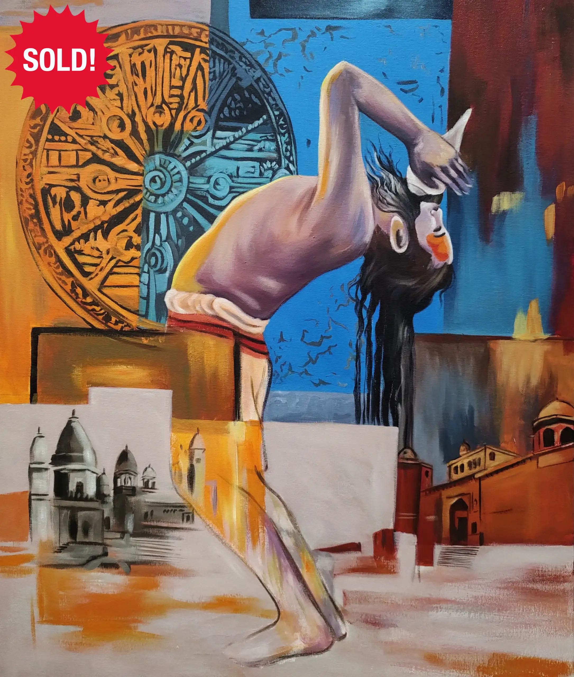 This artwork blends movement, heritage, and identity through the figure of a dancer frozen in a dramatic backbend. Surrounded by architectural sketches, warm tones, and traditional motifs, the painting feels like a tribute to culture, where the body becomes a bridge between history and the present moment.
