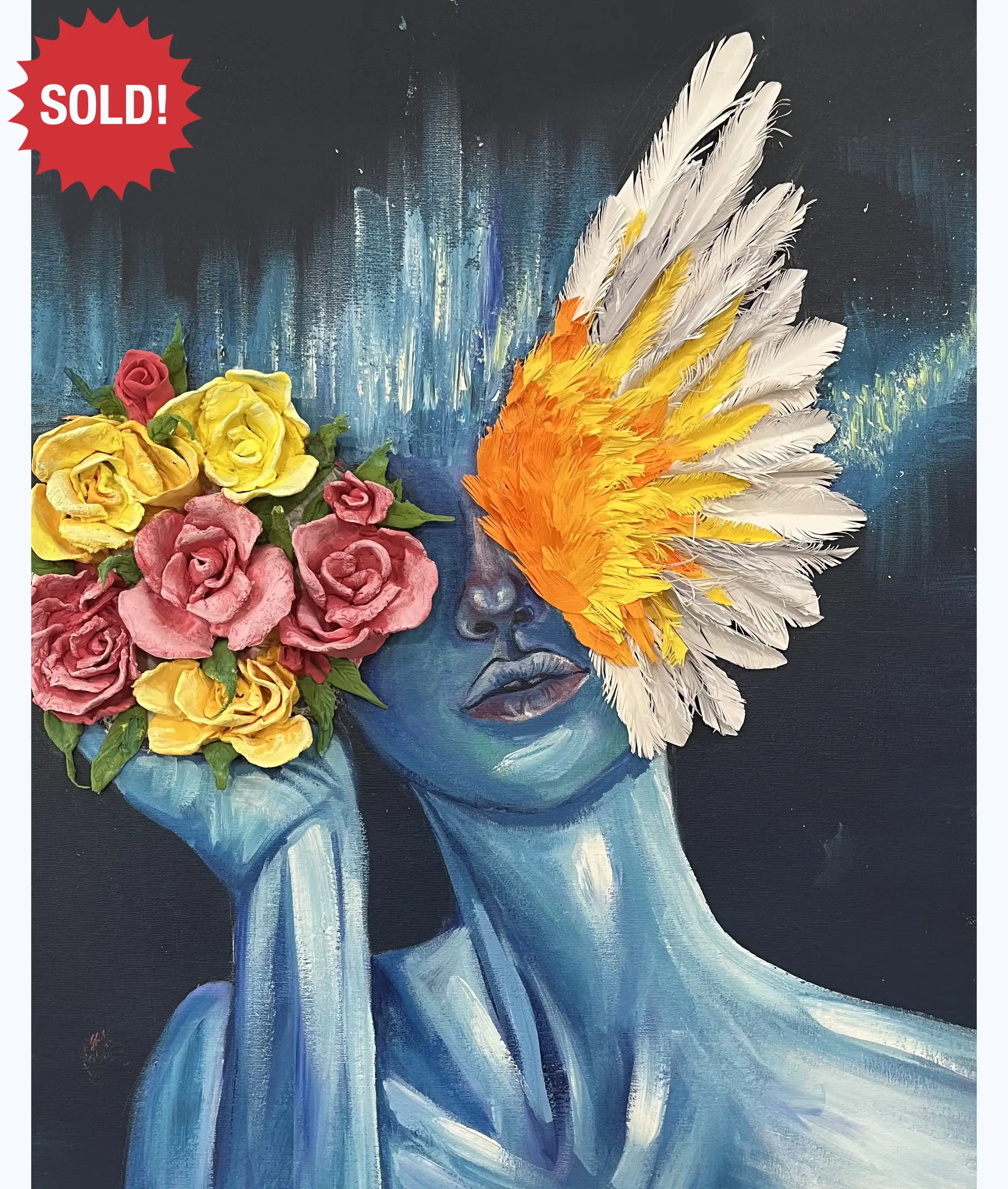 My art mirrors my womanhood, encompassing diverse facets that shape my being. I value the strength found in embracing the warrior and delicate beauty within. In this artwork, floral motifs and feathers highlight femininity, while a dark backdrop signifies resilience, showcasing a woman’s brilliance amid adversity.