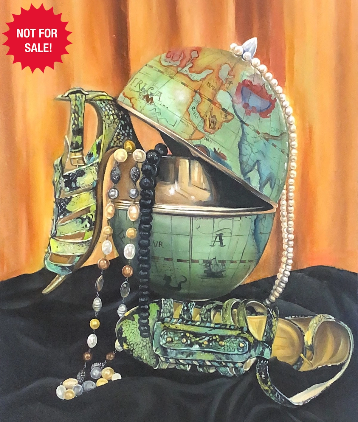 We must acknowledge and be responsible for the soil we stand on. Global warming is causing intense drought, storms, heat waves, rising sea levels, and melting of glaciers. I have painted the picture of a globe-shaped icebox that I found at a salvage store. It cuts the Earth in half, making its core visible to us. From it emerge pearls, necklaces and snakeskin shoes as a reminder of our desire for materialistic comforts and fleeting pleasures. We often forget that we must pay back to our planet in hopes of forming a harmonious relationship with nature.
