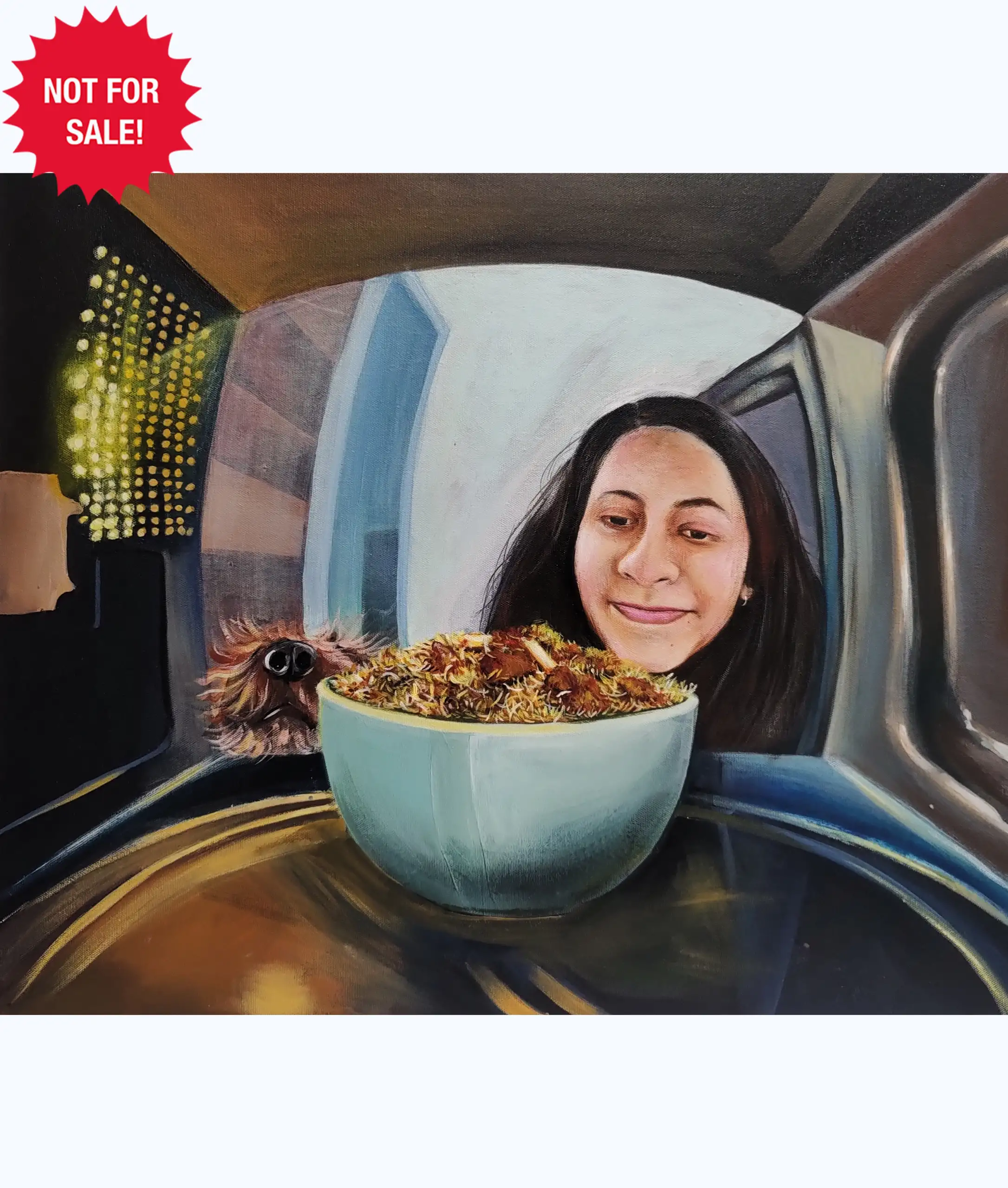 In this artwork, the central emphasis lies on a delectable bowl of biryani, while in the backdrop, I have depicted both my face and my faithful canine companion. My intention behind creating this piece was to express the profound affection I hold for my mother’s cherished recipe, encapsulating the depth of love and appreciation it evokes within me.