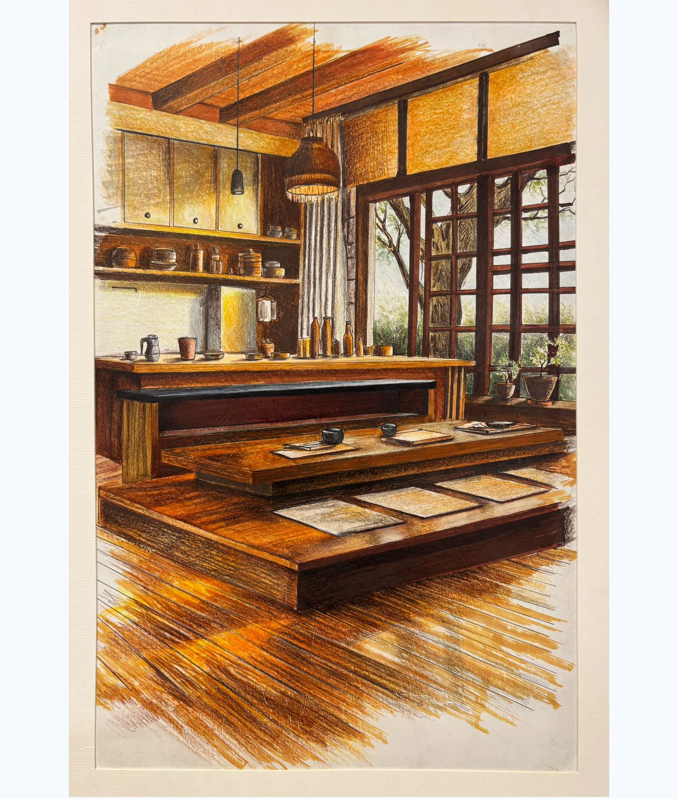 This drawing captures the tranquil elegance of a Japanese kitchen with a cozy sitting area, designed entirely with warm wooden interiors. A large window on the right frames a serene view of a tree and lush greenery, allowing soft sunlight to pour in. The golden rays illuminate the space, casting a warm glow that enhances the room’s natural beauty. This piece reflects the harmony between simplicity and nature, inspired by moments of peace and comfort in a thoughtfully designed space.