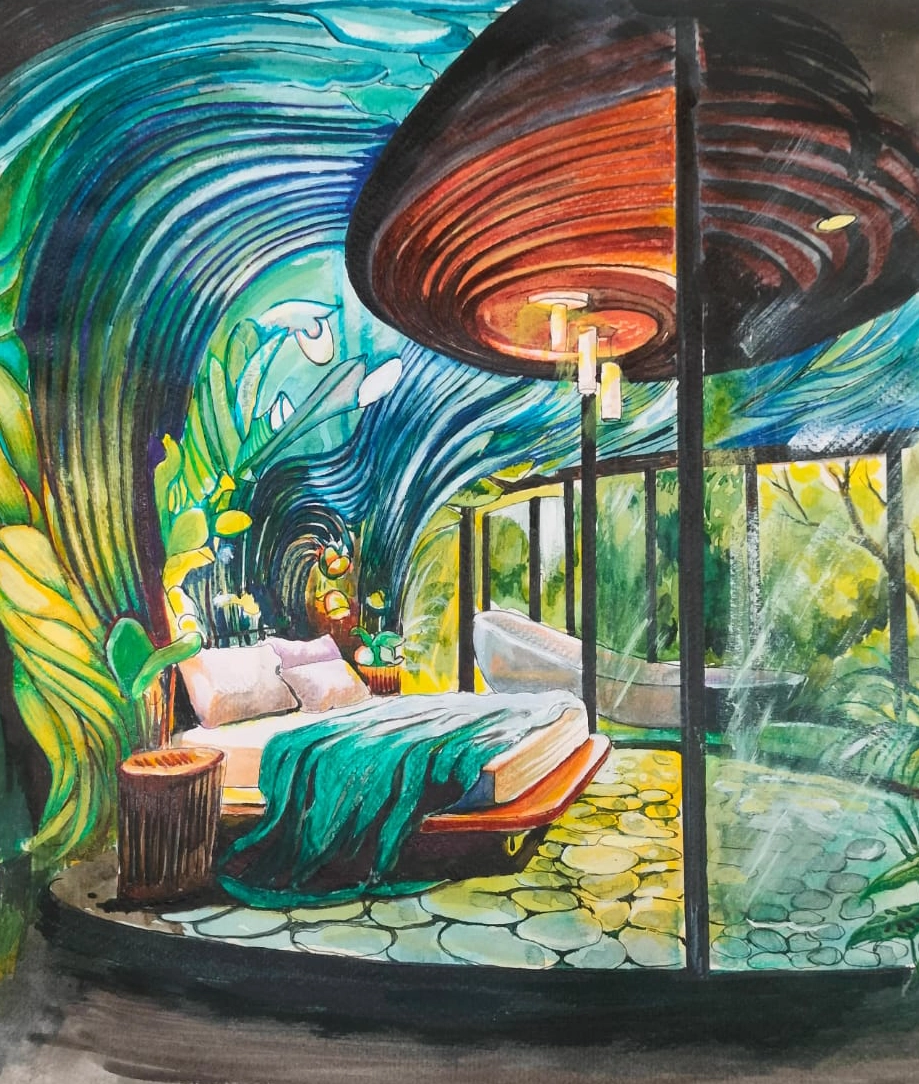 This artwork expresses my desire for a space dedicated to self-care and relaxation. It represents an intimate corner where I can re-energize my spirit. The soothing green and blue tones mirror a sense of luxury in nature, inviting calmness. The bathtub, filled with water, symbolizes a catalytic passage from the chaos of daily life to a refuge of meditative peace. It’s a reminder that we all deserve a retreat where we can truly unwind.