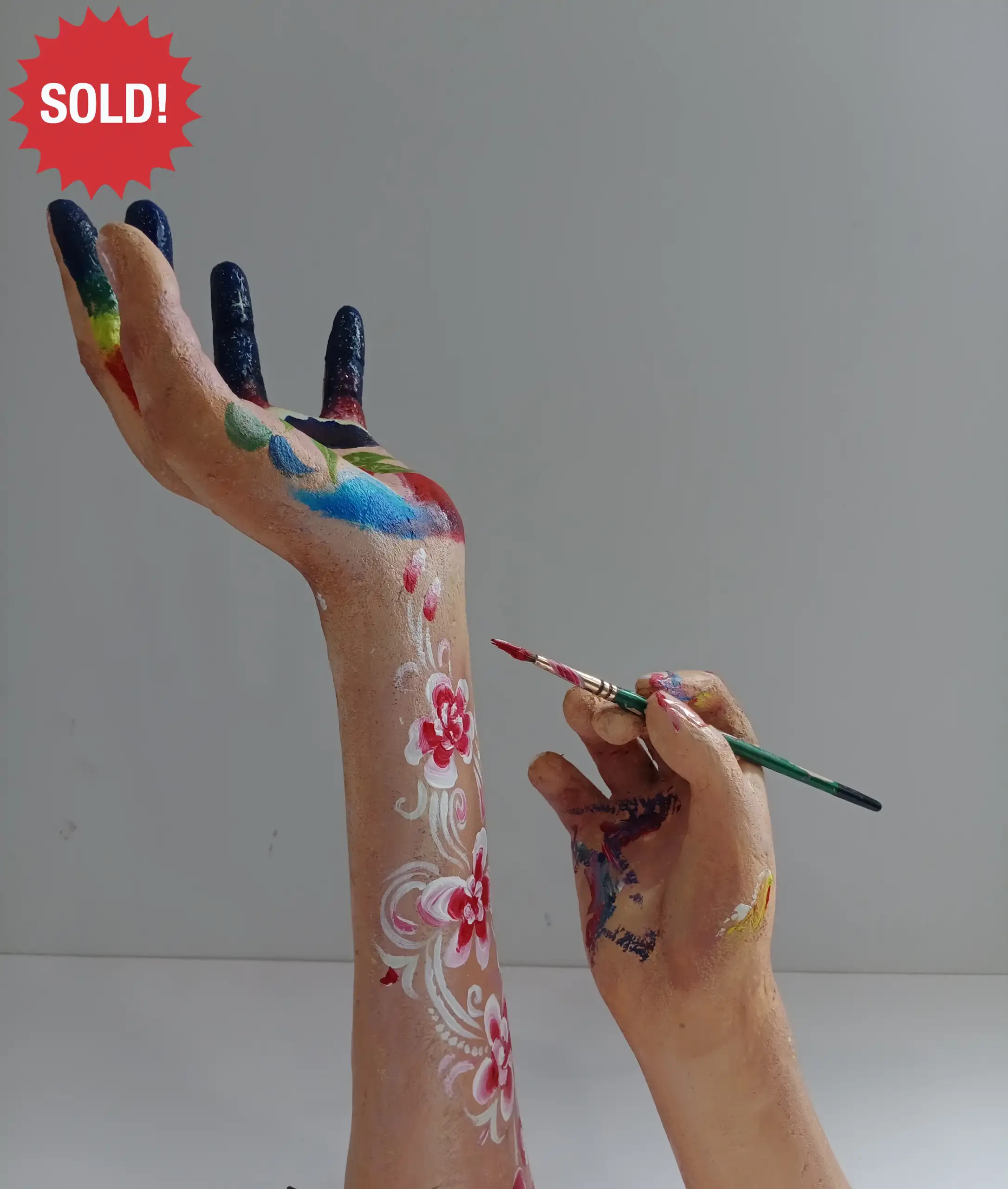 I often paint on my hands when I am bored. It is a quiet, meditative ritual that helps me focus. This piece turns that habit into a sculpture. I used iron wire, jute rope, and air-dry clay to show one hand painting the other. What started as a simple pastime became a way to celebrate the beauty in ordinary gestures, transforming small, everyday actions into art.