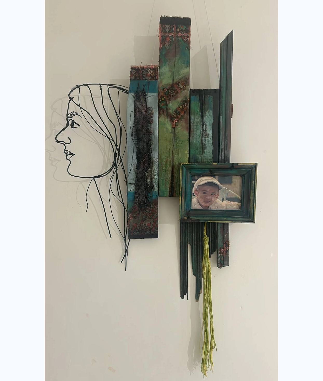 Medium Used: Wood planks, metal wire, fiber molding, picture of myself from childhood, paper, acrylic paints, sandpaper