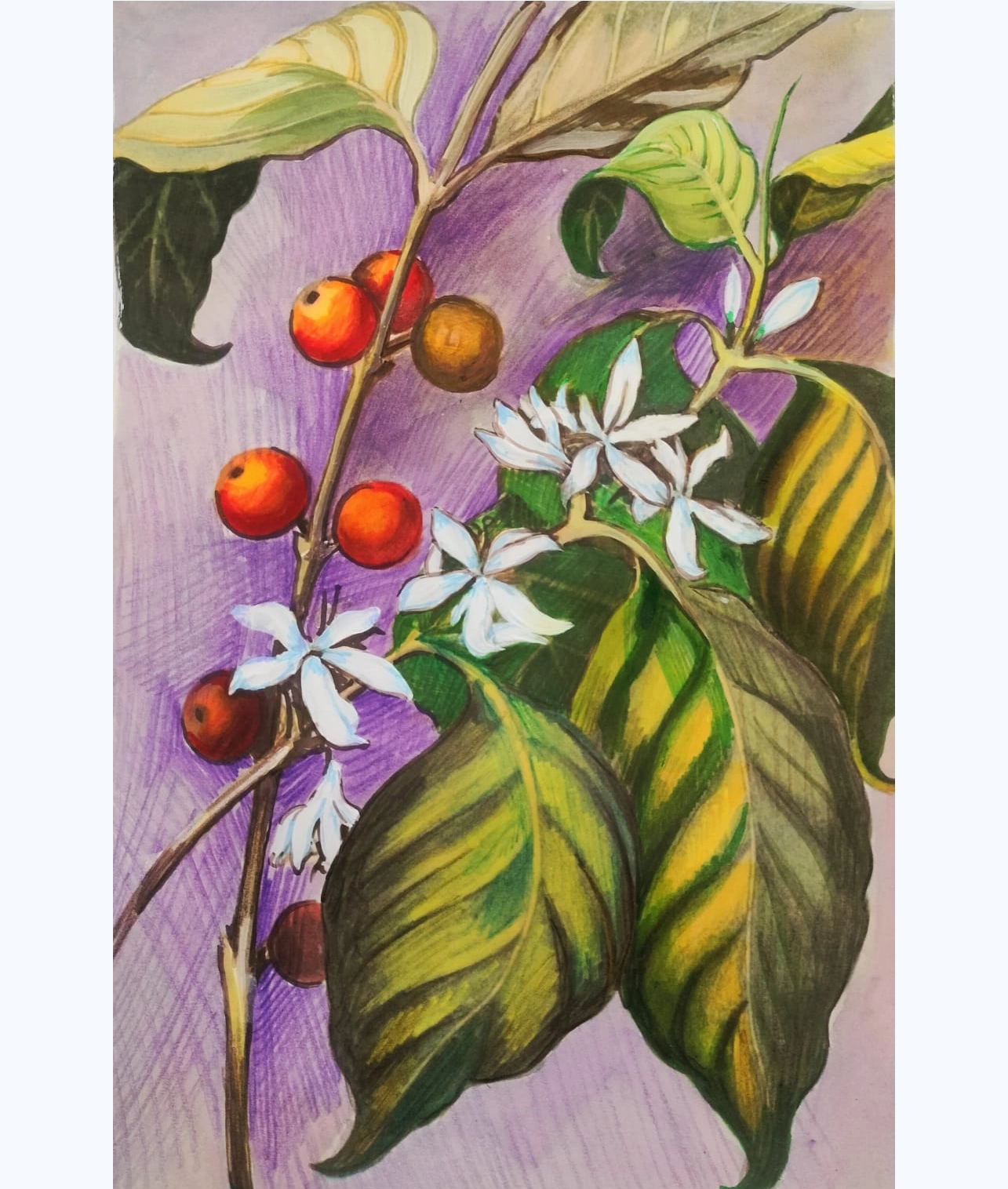I have created this artwork, depicting the stillness of a plant’s life, as it beautifully blooms into fresh star jasmines. The artwork speaks volumes about stages of life, with the withering leaves metaphorically portraying that life is transient, and consists of various phases such as growth, vibrancy, decline, and renewal.