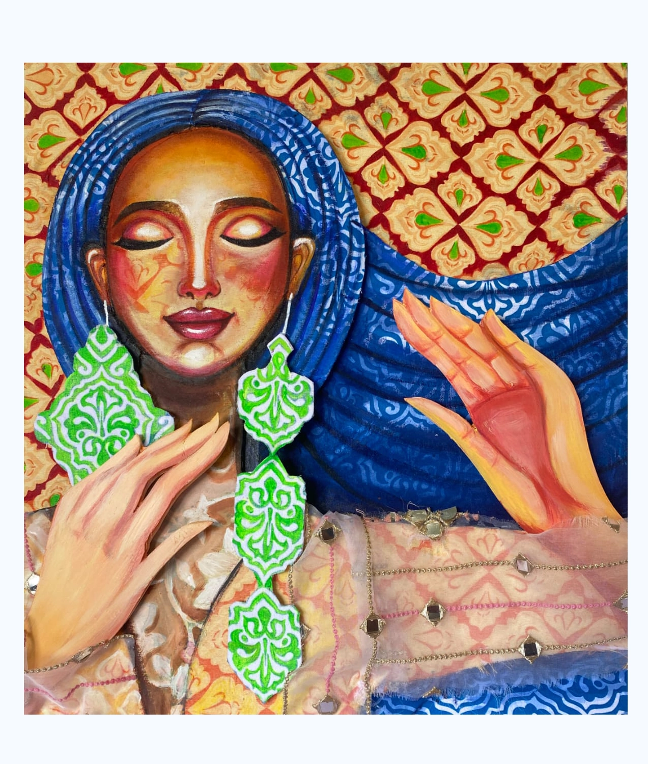 In this art piece, I have portrayed a serene moment of a lady deeply enjoying melodic music, her eyes gently closed as she surrenders to the rhythm. The bright blue scarf wrapped around her head symbolizes peace and tranquility, contrasting yet harmonizing with the vibrant energy of the brightly colored wallpaper in the background. Her hands, swaying gracefully to the music, represent freedom and the uninhibited flow of emotions that music can evoke. The long green danglers she wears add a touch of elegance. This piece invites viewers to explore the emotional depth of the lady’s experience and the peaceful escape it offers.