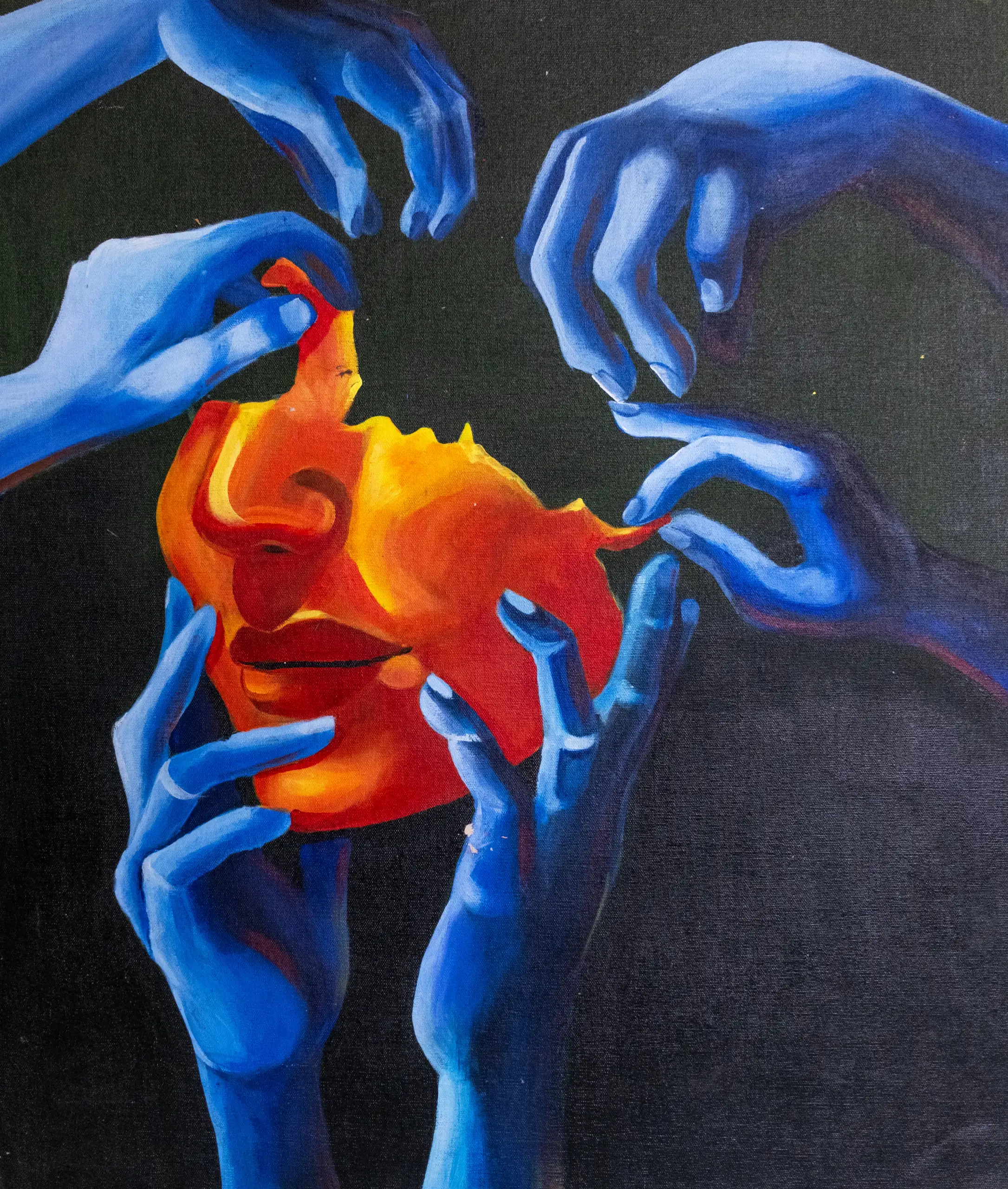 This surreal painting features several monochromatic blue hands reaching from the shadows to manipulate a glowing, orange-red face. The central face is physically fragmented, with pieces being pinched and pulled away as if it were a fragile mask. This evocative imagery suggests themes of external influence, the sculpting of self, and the loss of personal autonomy.