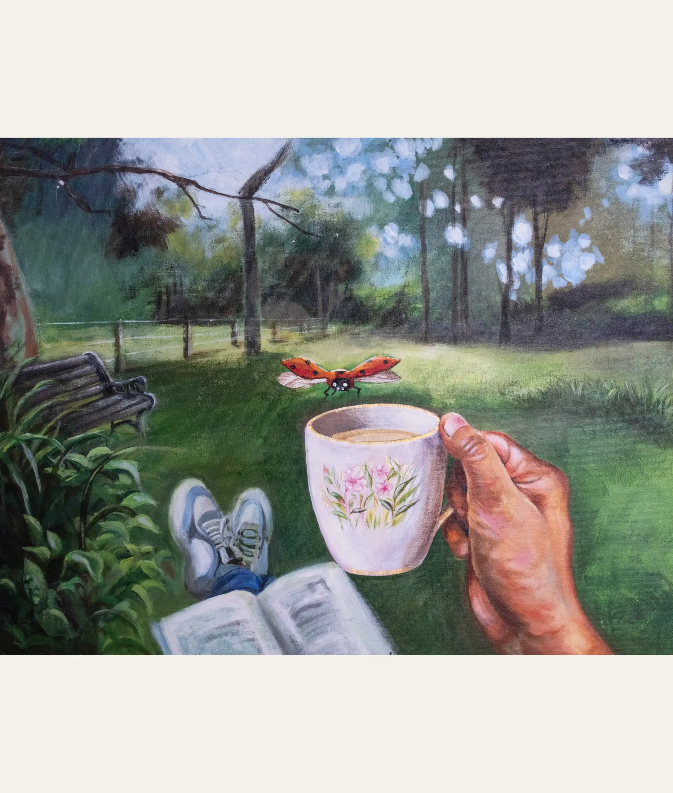 This art piece recounts my childhood memories of frequenting a nearby garden, where I would enjoy reading books while seated on the lush green grass. On one particular day, while I was engrossed in my reading, a charming ladybug landed on the cup that I held. Its beauty captivated me, prompting a desire to immortalize that moment on canvas with this artwork.
