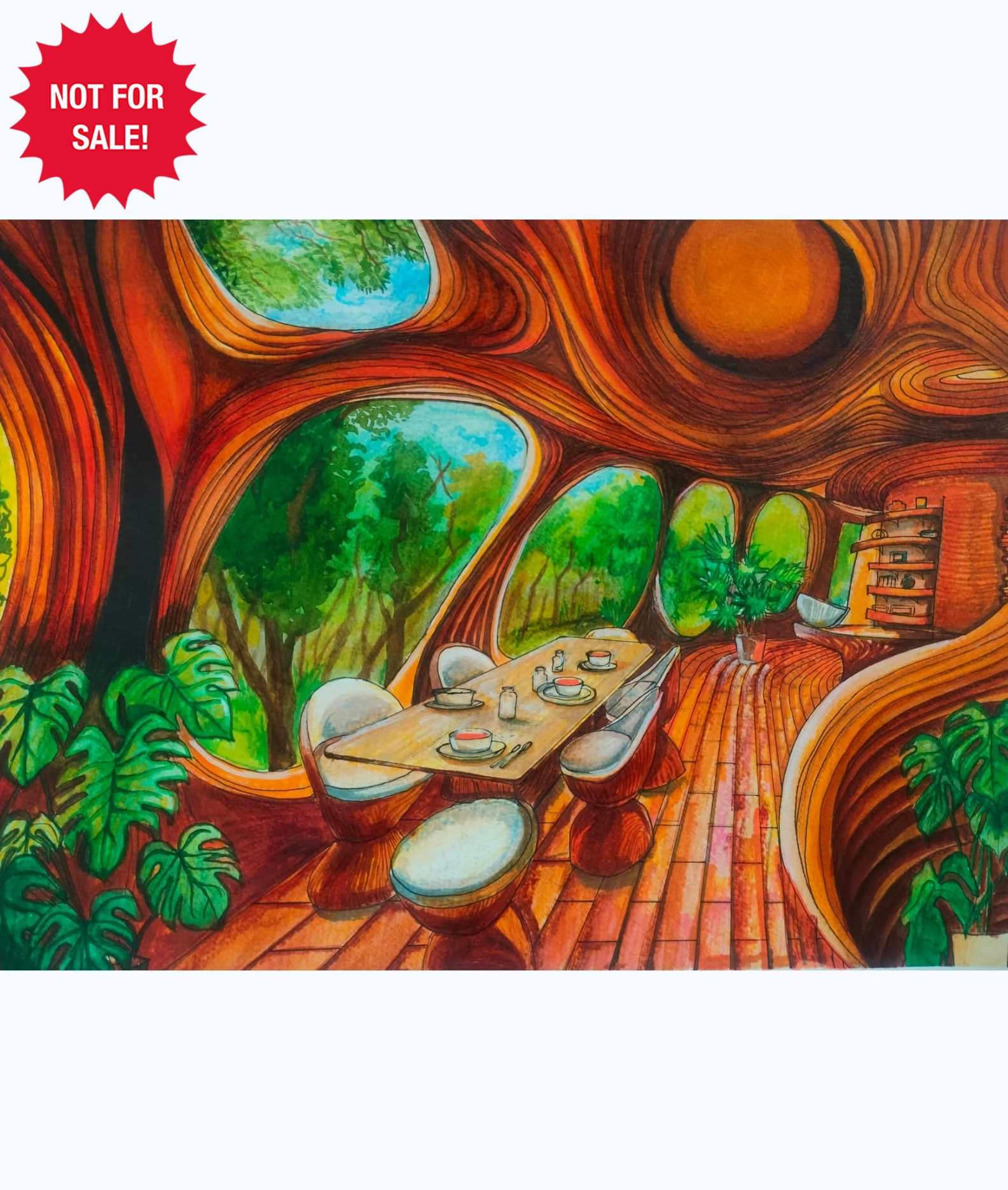 This artwork captures the harmony I dream of in my future home, a perfect balance of nature and comfort. The lush greens through the arched windows fill it with peace and serenity. The warm, curving wooden walls create a cocoon of safety. The earthy tones of the dining area invite you to sit, reflect, and share moments in this area.