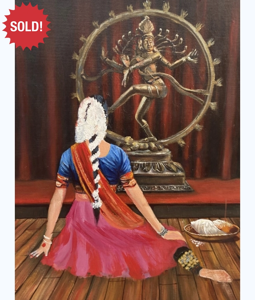 I This artwork is a vibrant celebration of dance captured on canvas. Every year on Guru Purnima, I get dressed in the traditional Kathak dress and ghungroos (small metallic bells strung together on anklets) to pay homage to Lord Nataraja.
