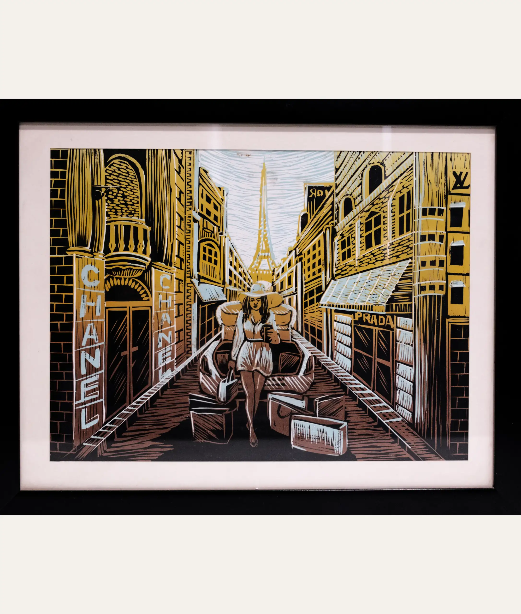 This artwork shows a stylish woman standing on a Paris street with the Eiffel Tower in the background. She is surrounded by shopping bags and luxury stores like Chanel and Prada. The warm golden colors and bold lines give the scene a fashionable, lively Paris feel.
