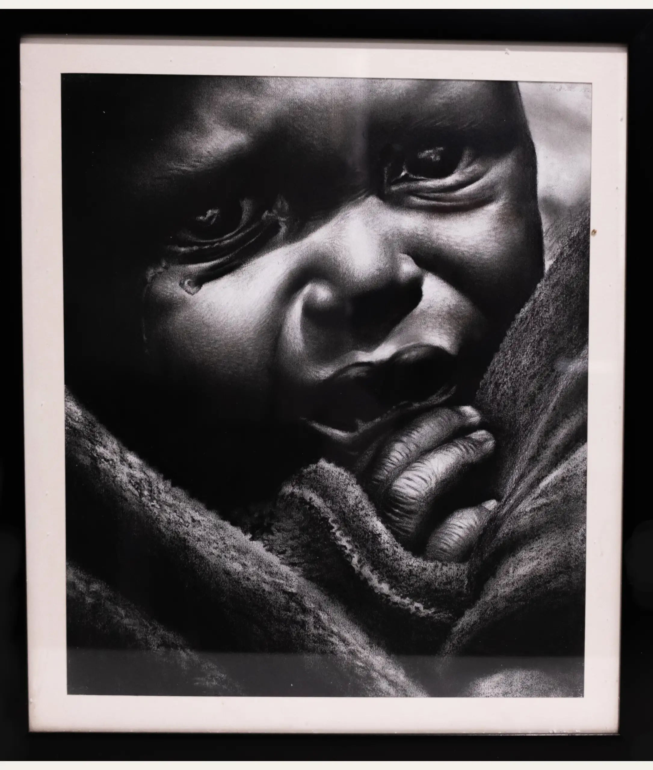 A poignant charcoal and graphite study capturing a raw moment of human vulnerability. Through hyper-realistic detail and dramatic lighting, it depicts the tear-streaked face of a child, emphasizing the universal language of grief and the weight of unseen burdens.