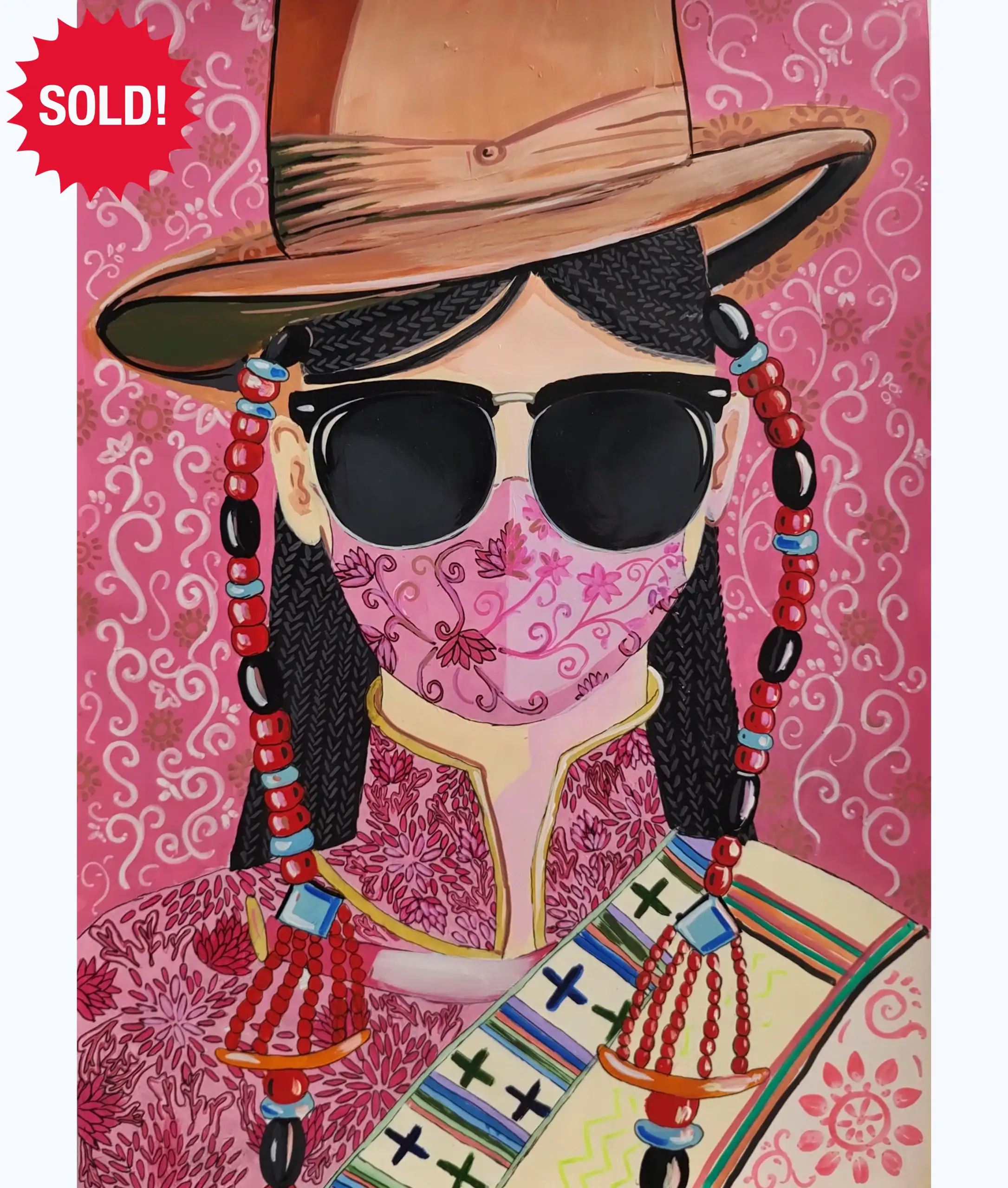 This piece portrays what I imagine sunny days in Lhasa, Tibet would look like. The woman is dressed in a traditional Khampa dress, with jewelry attached to her hair. She wears a mask similar to her outfit, a sun hat, and a pair of sunglasses.