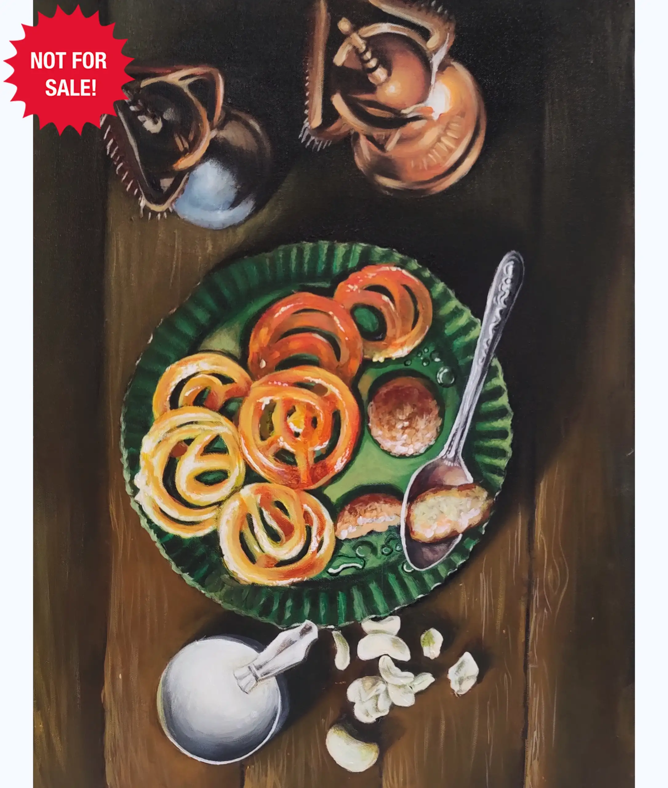 Through my painting, I invite you to indulge in a visual feast of Indian desserts. This artwork showcases the mouthwatering allure of Jalebi and Gulab Jamun, two of my favorite sweets. As I bite into these sweets I am transported into a blissful world where every morsel is a tantalizing delight.