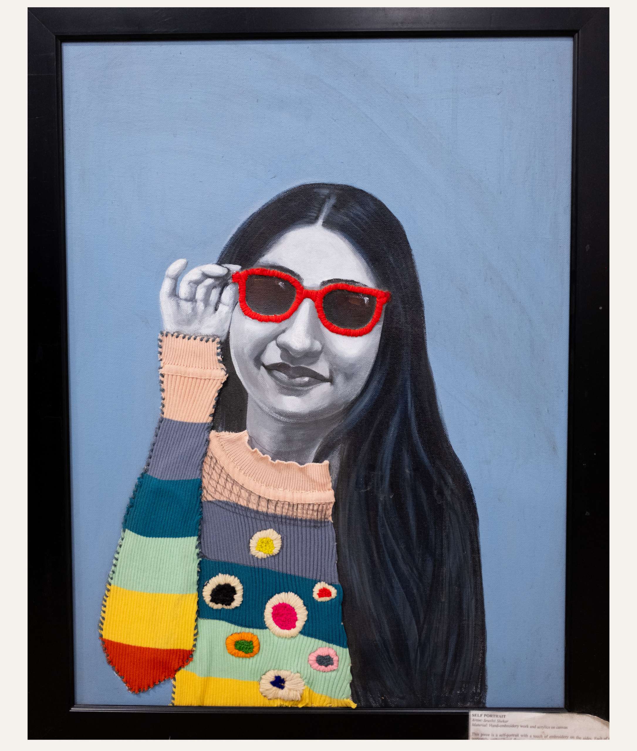 This striking self-portrait blends traditional painting with tactile textile art. A grayscale figure with long, dark hair tilts her head with a confident smile, adjusting vibrant red, yarn-embroidered sunglasses. Her eclectic sweater is a colorful collage of ribbed knit fabrics and raised, hand-stitched pom-poms, popping beautifully against a soft blue backdrop.