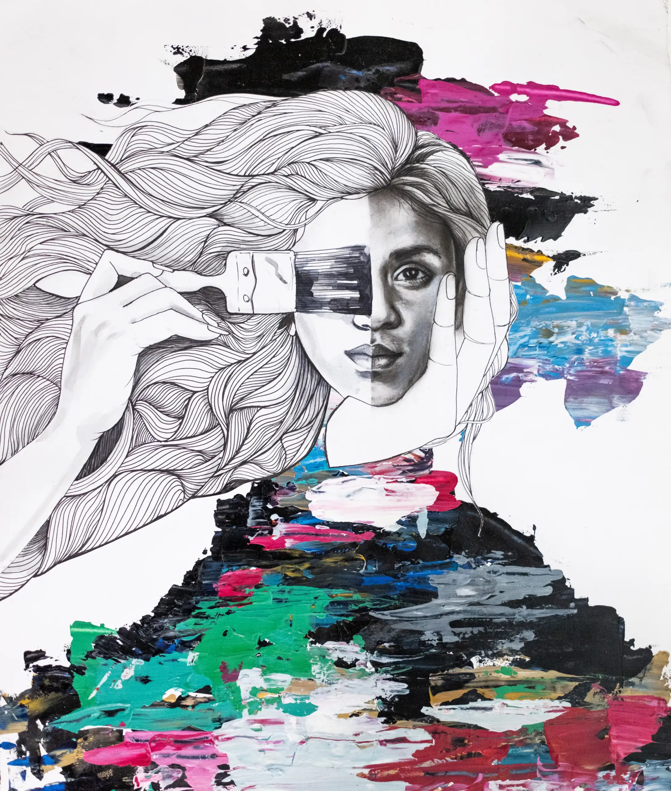 In this artwork I have aimed to draw a self-portrait to reflect my personality, thoughts, and passions. I wanted it to highlight my love for art, exude joy, and showcase different artistic skills. The concept behind this artwork is to depict my creative process and how I feel while contemplating a new piece. The paintbrush strategically covers my eye and a part of my forehead, symbolizing the core of my creativity and thoughts. One side of my face is depicted realistically, while the other side has a more cartoonish effect. This contrast, along with the vibrant colors at the bottom, illustrates how creativity can turn even a mundane and realistic image into something enjoyable and lively.