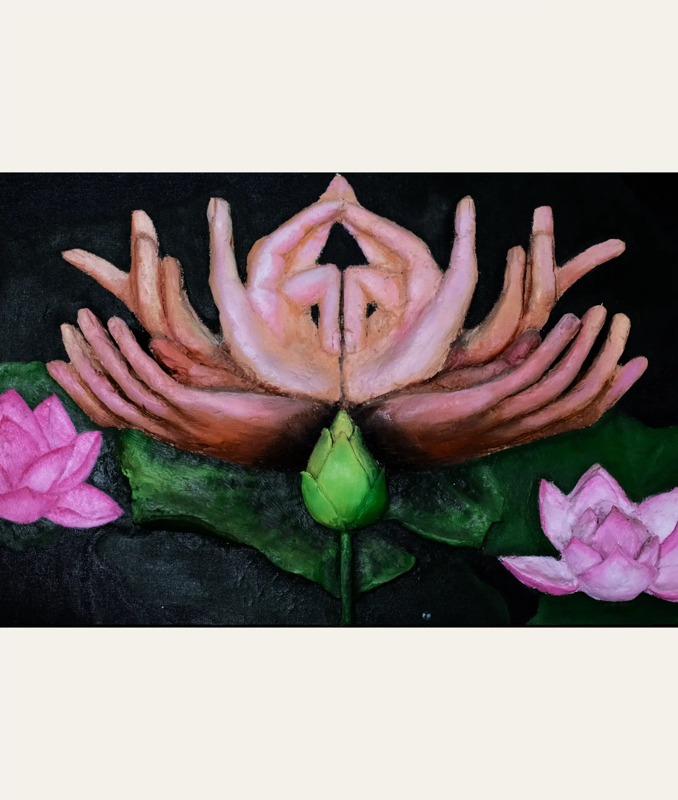 Two pairs of symmetrically mirrored hands form the sacred Padma (lotus) mudra, their outspread fingers mimicking blooming petals against a deep black background. A tender green lotus bud rises between them, flanked by two fully bloomed pink lotuses. A breathtaking meditation on spiritual awakening, purity, and growth from darkness.