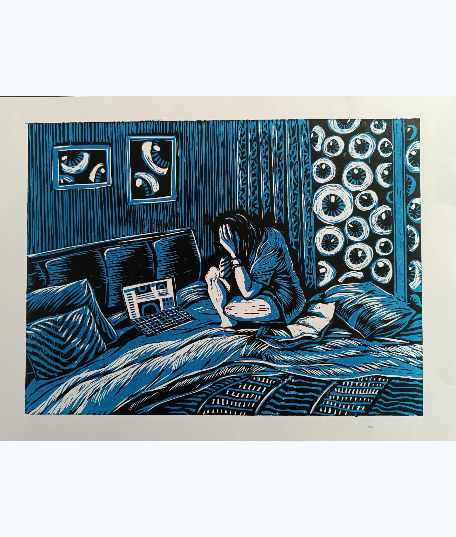 This artwork reflects the quiet, painful reality of losing our privacy. The eyes on the photo frames and windows represent the fact that we are constantly being monitored, even in our most private spaces. I used blue to convey the sadness of living in a world where we are never truly alone, yet feel deeply isolated. Every action seems controlled by unseen forces behind the screen, leaving us longing for a freedom that feels increasingly out of reach.