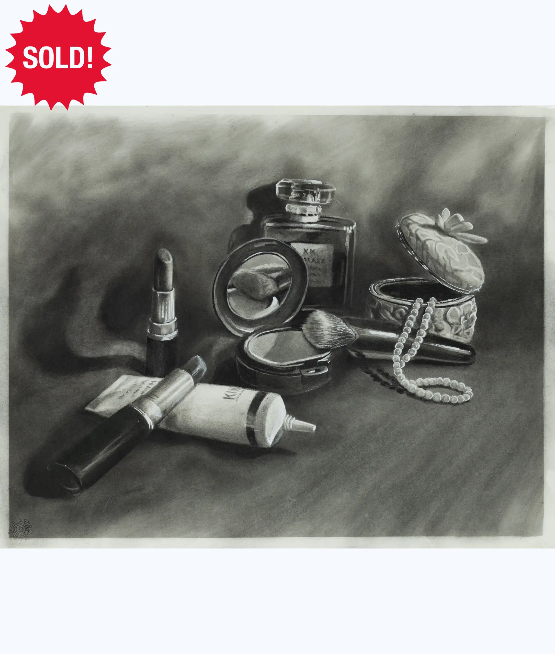 Hiding insecurities with makeup creates a false image and prevents self-acceptance. This trend enforces unrealistic beauty standards and harms self-esteem. We cover our flaws instead of accepting them, making it hard to show our true selves. The quest for perfection often overshadows our authenticity. This charcoal still life, in black and white, highlights the blurred line between right and wrong. It questions whether the pursuit of a flawless appearance is worth the suffering inflicted on animals through cruel testing, despite advancements in technology, and challenges us to rethink the cost of maintaining such facades.