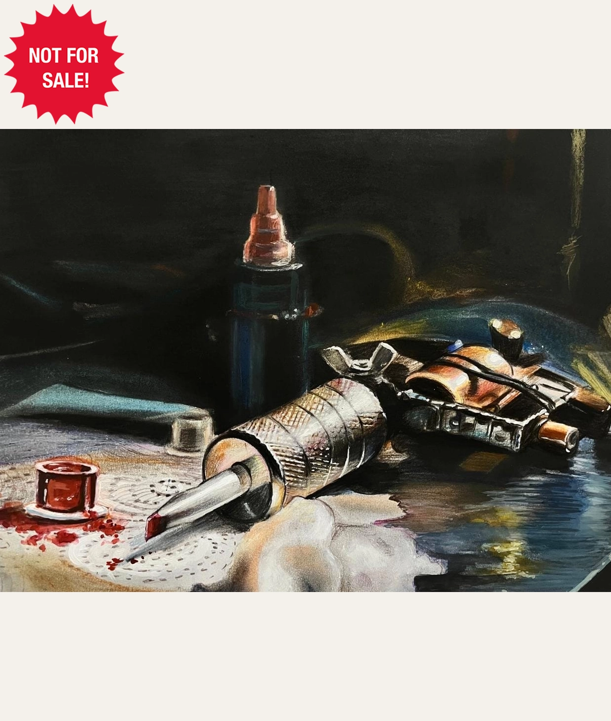 I made this artwork as a way of marking a new beginning. The tattoo machine is something I have recently started learning to use, and it already feels very personal. I painted it carefully to understand its form and weight, seeing it not just as a tool but as a bridge between precision and creativity. This piece shows my growing connection to tattooing and the idea of creating something lasting.