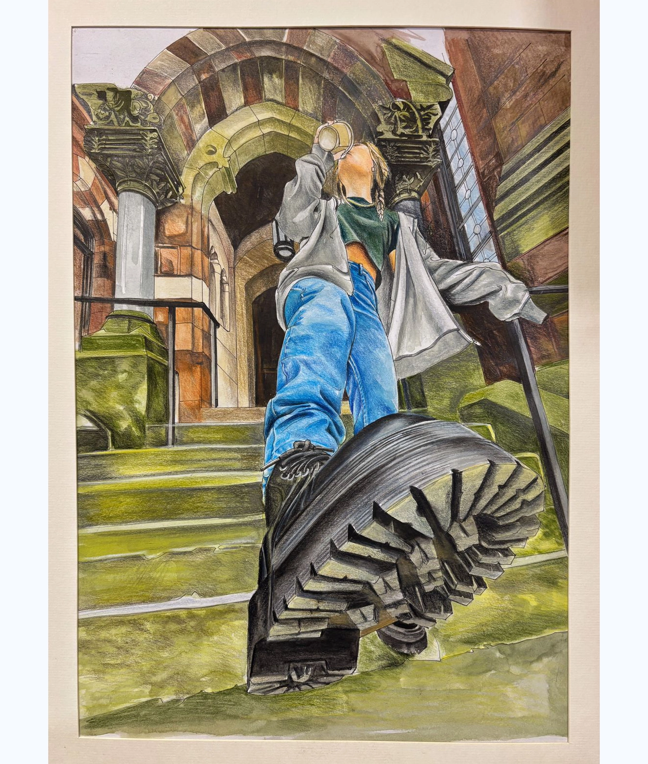 In this piece, I have depicted a girl on the steps of a grand historic building. Her large, rugged boot takes center stage, creating a strong perspective. As she drinks from a cup and looks up, a sharp contrast is created with the detailed stone carvings and arches behind her. I created this piece to examine how modern fashion interacts with historical settings, blending different eras into a cohesive visual narrative.