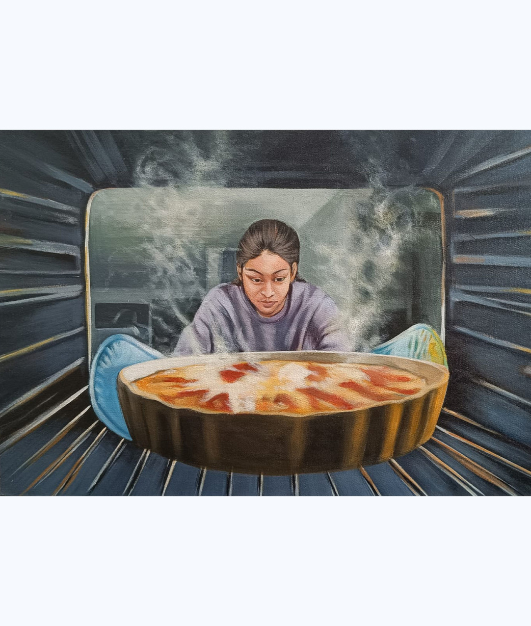 She sits in front of the oven, watching the food rise and bubble. Warm light and steam fill the space. Her eyes stay fixed, calm and thoughtful, as if waiting for more than just a meal. It feels like a quiet moment of patience, comfort, and care inside an ordinary part of everyday life.
