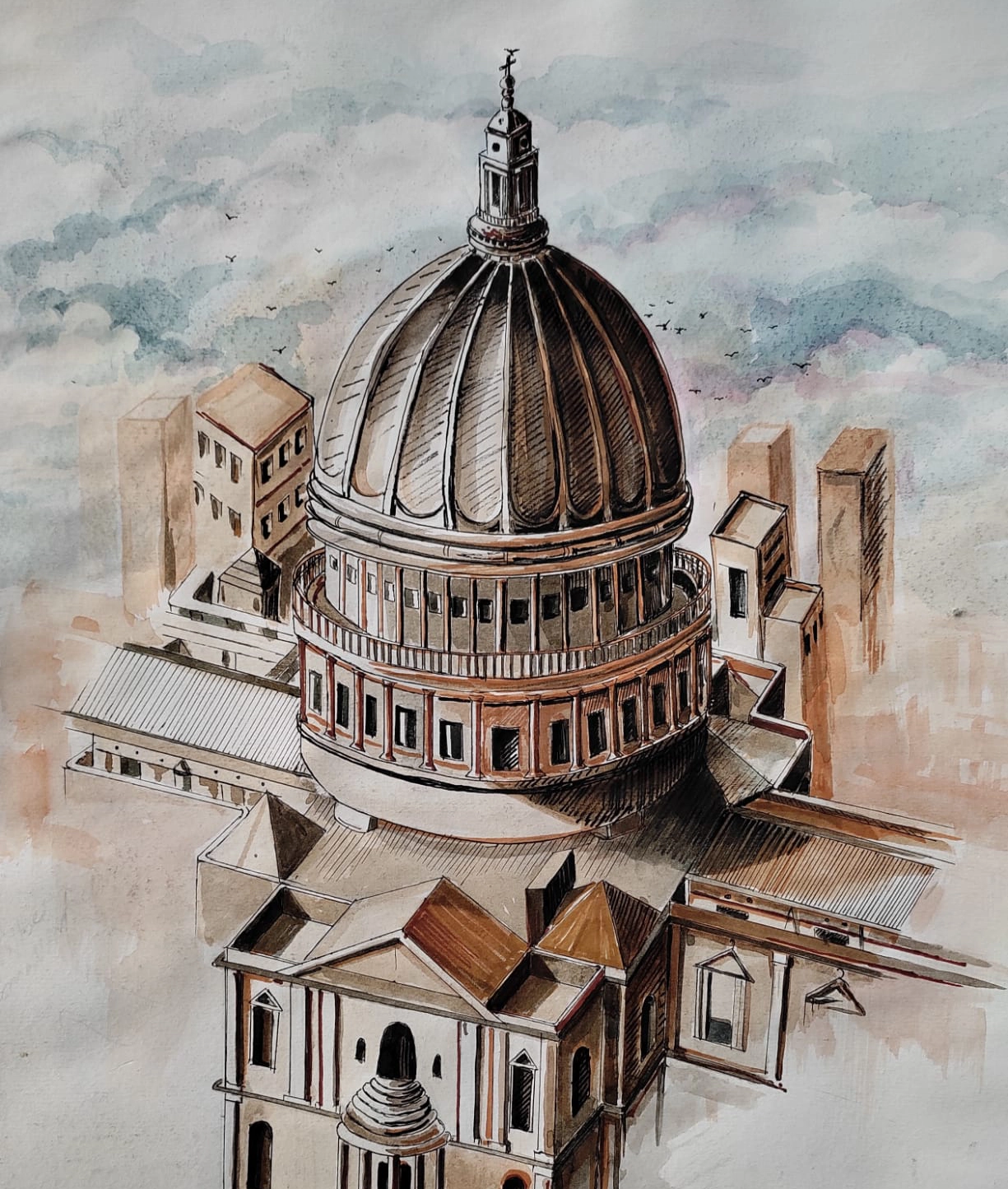 This watercolour showcases a grand dome-topped structure with Roman-inspired pillars, exuding timeless elegance. Contemporary buildings in the background contrast with its historic