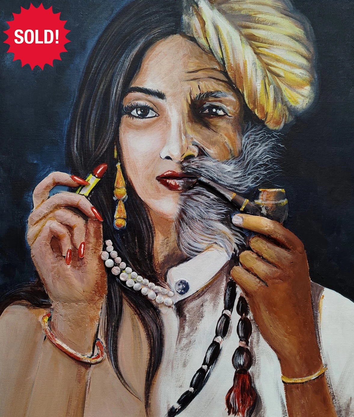 This portrait captures the striking duality of identity through a single face divided into contrasting cultural expressions. One side reflects modern elegance—bold lipstick, polished nails, and pearl jewellery—while the other embodies traditional strength, marked by a turban, rugged textures, and a pipe releasing curling smoke. The merging of both halves creates a powerful visual narrative about heritage, individuality, and the coexistence of tradition and contemporary life. The intense gaze draws the viewer in, reminding us that identity is not singular—it is layered, lived, and proudly carried.