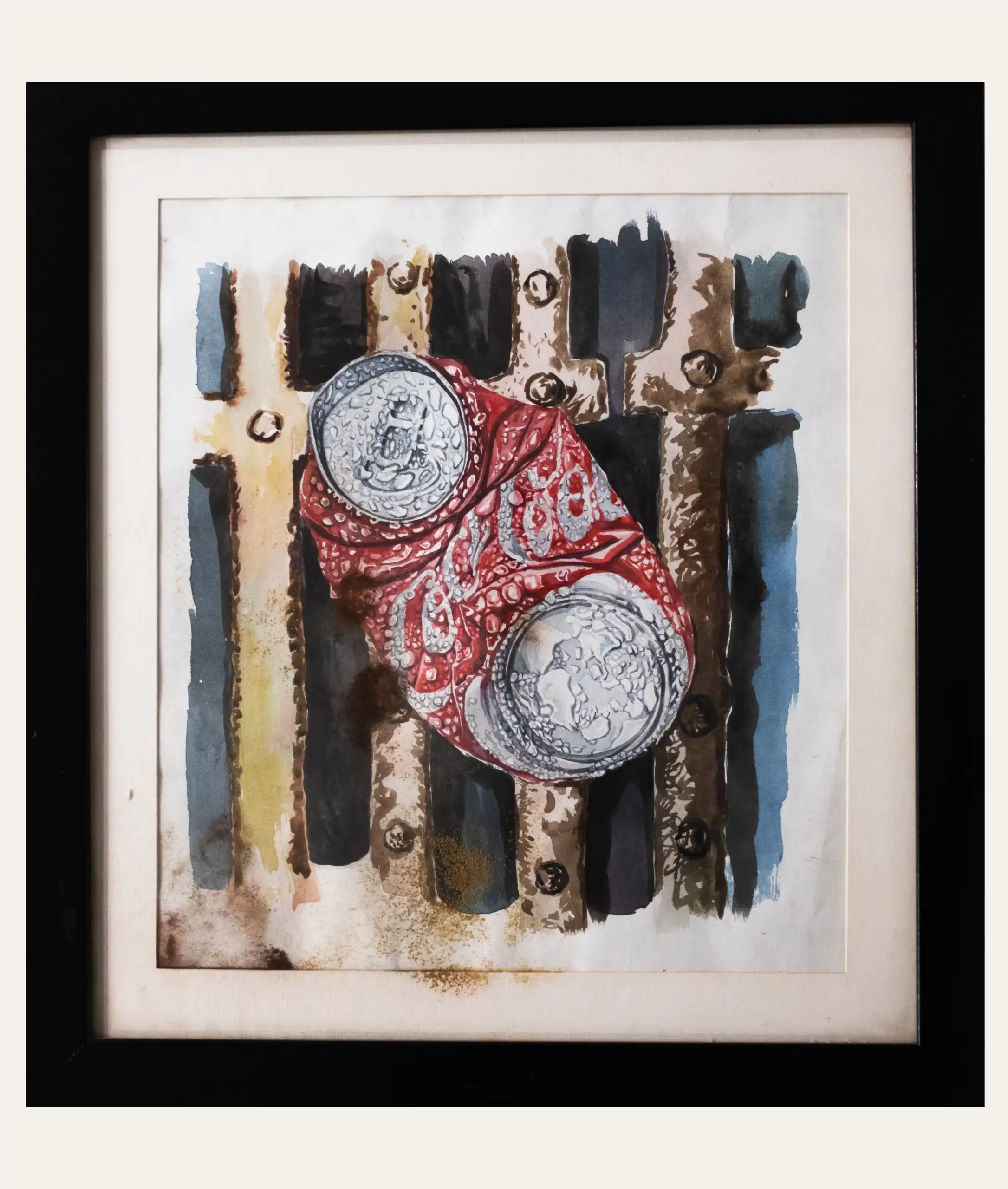 This piece depicts a crushed red soda can resting atop a rusted metal grate. The detailed rendering of condensation droplets and crumpled metal contrasts with the coarse texture of the iron bars, evoking themes of consumerism, waste, and environmental decay.