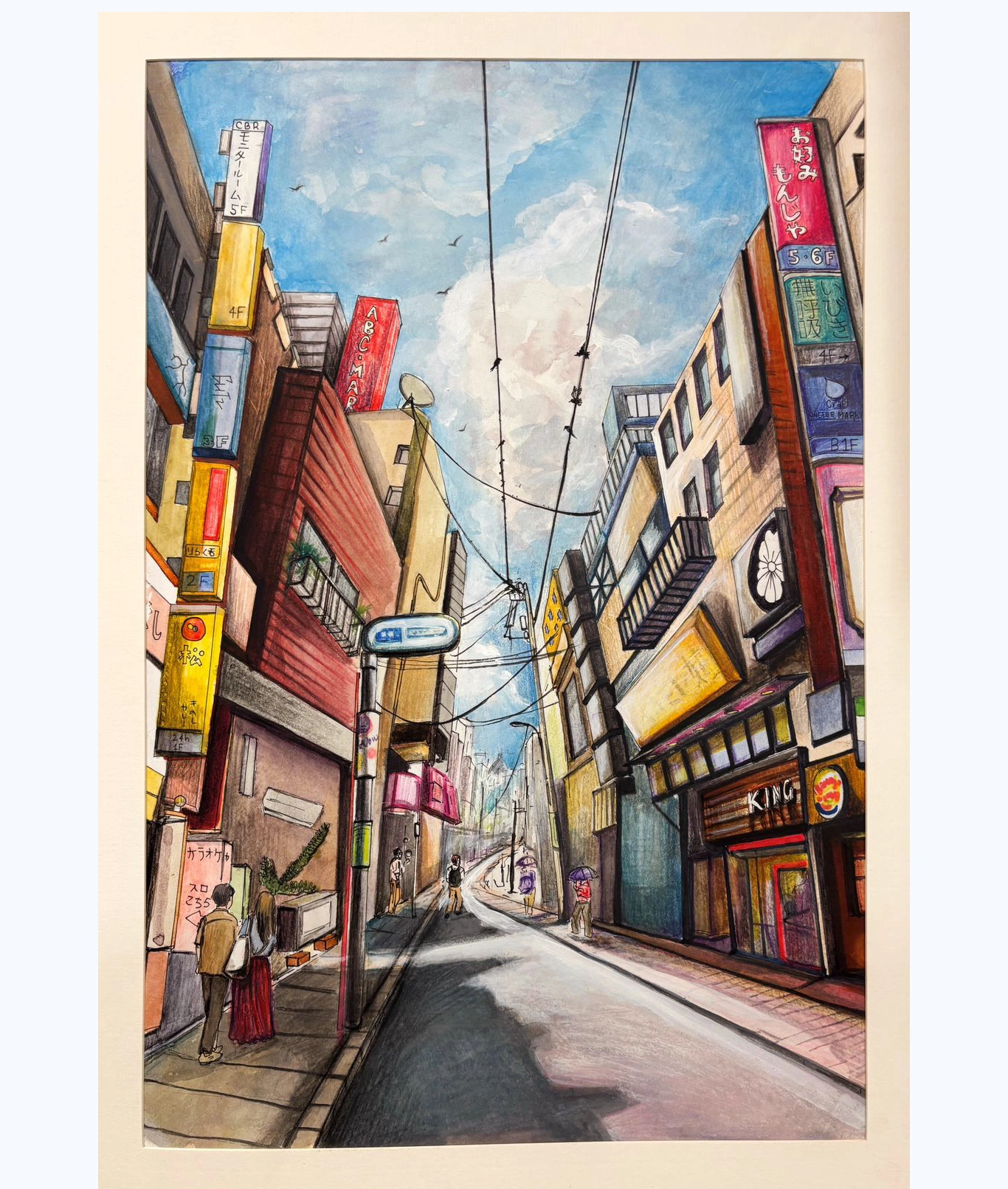 This illustration captures a vibrant street scene from a low-angle, three-point perspective. Flanked by tall, slender buildings adorned with colorful signage and tangled power lines, the narrow road draws the eye toward a bright, clouded sky. Pedestrians dot the sidewalks, adding a sense of daily rhythm and scale to this meticulously rendered cityscape.