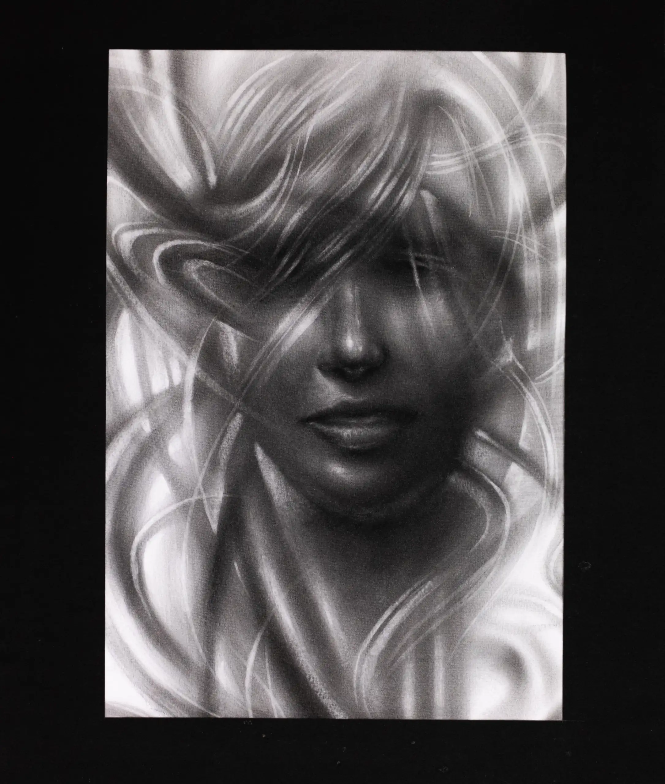 This ethereal charcoal portrait uses soft, blended gradients to create a sense of mystery. Wisps of light dance across a shadowed face, blurring the lines between reality and dream, evoking a quiet, haunting beauty through delicate monochromatic transitions.