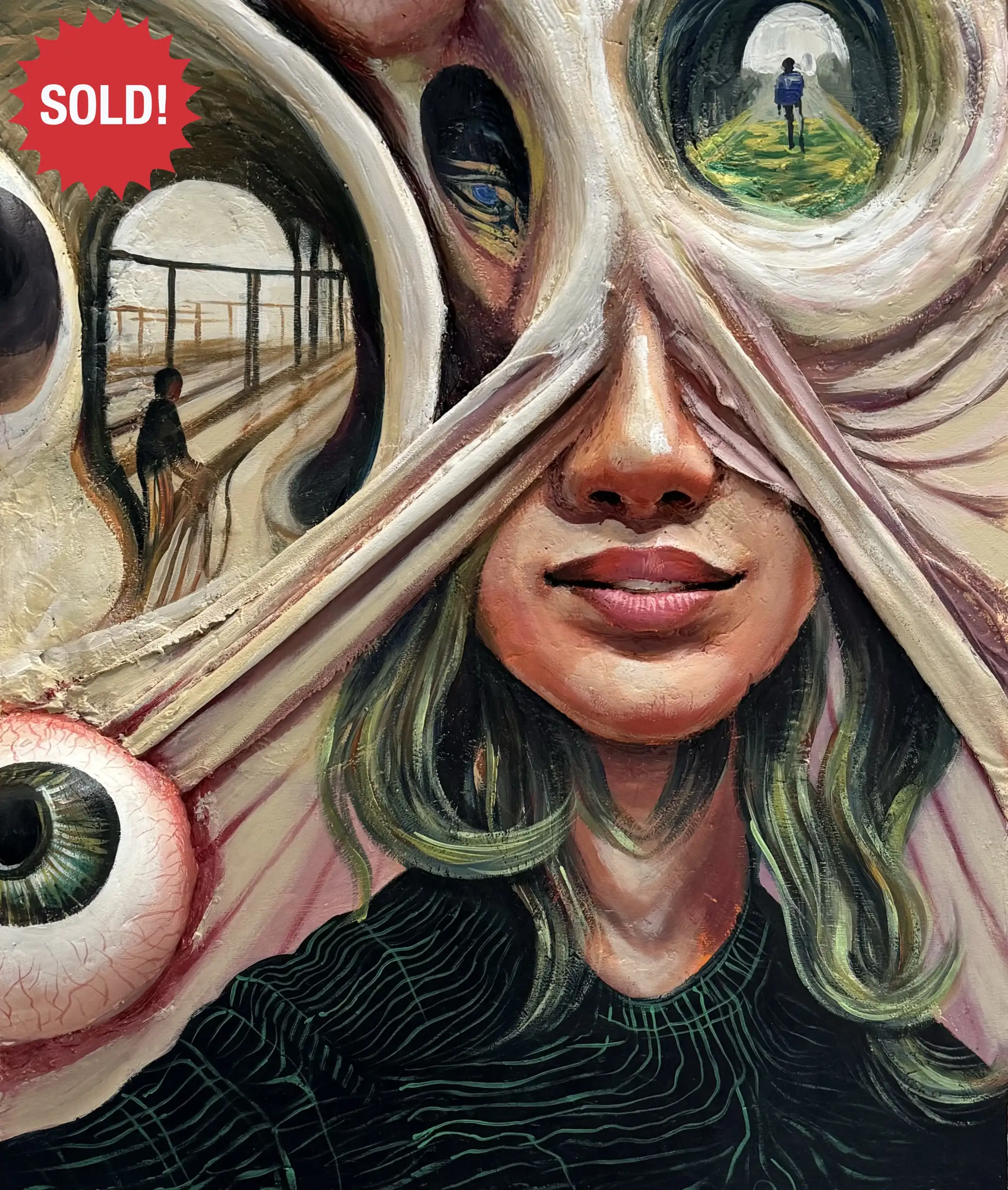 A portrait where eyes transform into layered tunnels of memory and imagination. Each opening holds a different scene, suggesting the many worlds a person carries within—past moments, quiet journeys, and inner landscapes that shape how we see and feel.